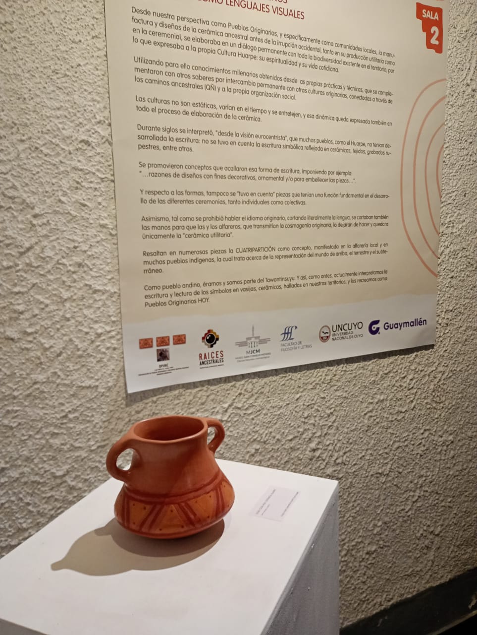 Luego de una ceremonia rogativa llevada a cabo por mujeres de comunidades huarpes y las canciones interpretadas en vivo por Yazmin González y Bibiana Miño, quedó habilitada la muestra, conformada por materiales y proyecciones audiovisuales y que consta de un recorrido que muestra el proceso de producción alfarera, recuperando desde los materiales para la producción de las vasijas hasta los significados que tienen tanto cada paso del proceso como las imágenes que con que eran ornamentadas las piezas.